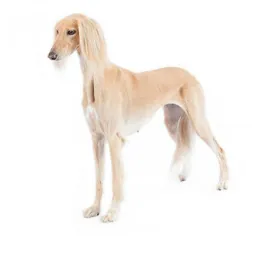 Anjing pengintai yang anggun, atletis, berukuran sedang, jenis anjing Saluki memiliki rambut yang lembut dan halus, sering kali hadir dengan rambut tipis dan lembut yang berukuran lebih panjang (feathering) pada kaki dan telinga, dan terkadang di daerah tenggorokan . Anjing Saluki berambut halus tidak memiliki kondisi feathering tersebut. Rambut mereka hadir dalam berbagai warna atau kombinasi warna, kecuali belang-belang. Saluki jantan dewasa tingginya 58-71cm, dengan betina sedikit lebih kecil. Tumbuh dewasa, beratnya sekitar 13-30kg.
