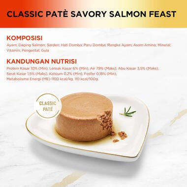 Fancy Feast Classic Patè Savory Salmon Feast merupakan makanan basah untuk kucing dewasa yang diformulasikan dengan kandungan nutrisi yang lengkap dan seimbang dengan mengikuti standar profil makanan yang telah ditentukan oleh AAFCO (American Association Feed Control Official) untuk memenuhi kebutuhan nutrisi harian kucing kesayangan.