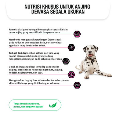 - Formula aksi ganda yang dikembangkan secara ilmiah : untuk anjing yang sensitif kulit dan pencernaan
