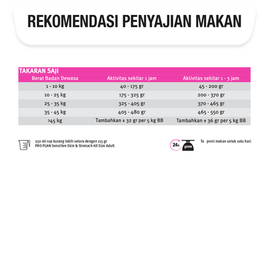 Layaknya manusia, beberapa anjing terlahir lebih sensitif dibanding lainnya. Saat intoleransi makanan terjadi, sistem imunita bereaksi negatif pada bahan-bahan yang aman seperti ayam, daging, kedelai, jagung dan gandum. PRO PLAN Dog Adult Sensitive Skin &; Stomach All Size Salmon Tuna telah teruji klinis membantu menurunkan resiko reaksi negatif perut pada makanan, dan kombinasi nutrisinya dapat membantu kondisi kulit dan kesehatan perut anjing Anda. Makanan yang lengkap dan seimbang untuk anjing dewasa segala ukuran. PRO PLAN Dog Adult Sensitive Skin &; Stomach All Size Salmon Tuna diformulasikan untuk membantu mengurangi resiko alergi makanan. Merupakan produk kombinasi untuk menjaga kesehatan kulit dan perut.