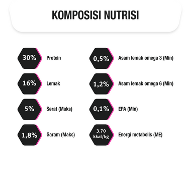 - Untuk anjing yang alergi terhadap gandum dan daging, dibuat tanpa kandungan gandum, jagung, keledai, daging ayam, dan sapi