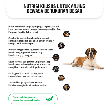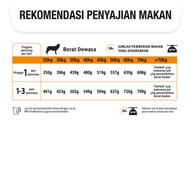 Pro Plan Dog Adult Essential Health Large Chicken merupakan makanan yang lengkap dan seimbang untuk anjing dewasa berukuran besar dengan berat badan lebih dari 25 kg. Merupakan kombinasi dari nutrisi terpilih yang secara spesifik disesuaikan dengan ukuran anjing yang berbeda-beda untuk mendukung kebutuhan spesifik mereka, dan menjaga kondisi optimal anjing.