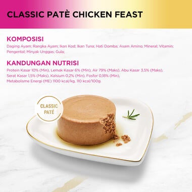 Fancy Feast Classic Patè Chicken Feast merupakan makanan basah untuk kucing dewasa yang diformulasikan dengan kandungan nutrisi yang lengkap dan seimbang dengan mengikuti standar profil makanan yang telah ditentukan oleh AAFCO (American Association Feed Control Official) untuk memenuhi kebutuhan nutrisi harian kucing kesayangan.