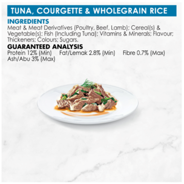 Fancy Feast Inspirations Tuna Courgette Wholegrain Rice merupakan makanan kucing basah untuk kucing dewasa yang terinpirasi dari resep gourmet chef. Varian ini mengandung potongan besar tuna disajikan bersama courgette dan beras utuh yang mengundang selera sehingga cocok disajikan untuk kucing kesayangan Anda.