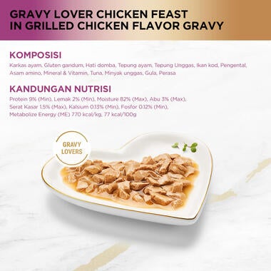 Fancy Feast Gravy Lovers Chicken Feast in Grilled Chicken Flavor Gravy merupakan makanan basah untuk kucing dewasa yang diformulasikan dengan kandungan nutrisi yang lengkap dan seimbang dengan mengikuti standar profil makanan yang telah ditentukan oleh AAFCO (American Association Feed Control Official) untuk memenuhi kebutuhan nutrisi harian kucing kesayangan.