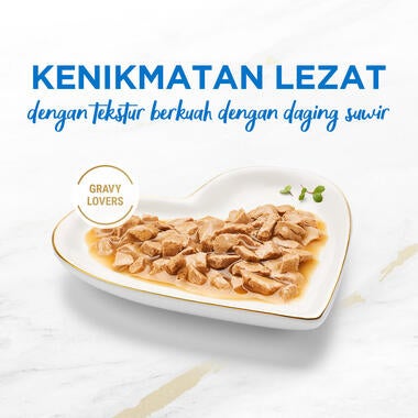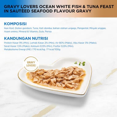 Fancy Feast Gravy Lovers Ocean Whitefish & Tuna Feast in Sautèed Seafood Flavor Gravy merupakan makanan basah untuk kucing dewasa yang diformulasikan dengan kandungan nutrisi yang lengkap dan seimbang dengan mengikuti standar profil makanan yang telah ditentukan oleh AAFCO (American Association Feed Control Official) untuk memenuhi kebutuhan nutrisi harian kucing kesayangan.