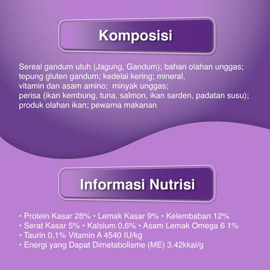 Makanan Kucing Kering yang diproduksi dengan Nutrisi yang lengkap dan seimbang, di perkaya dengan Protein, Asam lemak Esensial, Anti-oxidan, Vitamin A &;Taurine dengan campuran berbagai rasa Ikan.