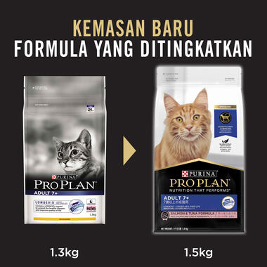 Pro Plan Adult 7+ kini hadir dengan kemasan baru dan formula yang ditingkatkan untuk kucing senior berusia 7 tahun ke atas. Pro Plan Adult 7+ terbuat dari ikan salmon dan tuna asli sebagai bahan baku utamanya. Tak hanya diperkaya dengan Probiotik aktif untuk menjaga kesehatan pencernaannya, Pro Plan Adult 7+ juga mengandung LONGEVIS yang bantu meningkatkan kualitas hidup serta memperpanjang usia kucing senior.