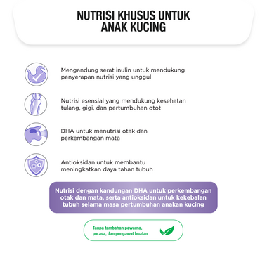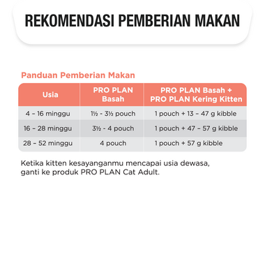 Pro Plan Wet Kitten diformulasi untuk memenuhi kebutuhan anak kucing dari umur 4 minggu – 1 tahun. Pro Plan Wet Kitten mengandung DHA untuk perkembangan otak dan mata, serta antioksidan untuk kekebalan tubuh selama masa pertumbuhan pada anakan kucing.