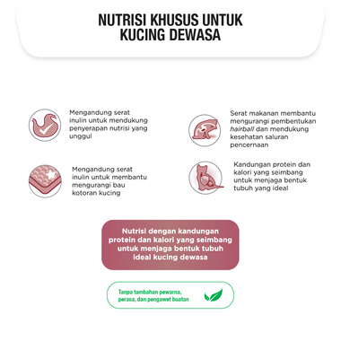 - Mengandung inulin untuk membantu mengurangi bau kotoran kucing