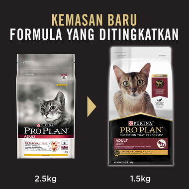 Pro Plan Adult kini hadir dengan kemasan baru dan formula yang ditingkatkan bagi kucing dewasa berusia mulai 1 tahun. Pro Plan Adult dibuat dari daging ayam asli sebagai bahan baku utama dan diperkaya dengan Probiotik Aktif untuk mendukung kesehatan pencernaan serta daya tahan tubuh kucing kesayanganmu.