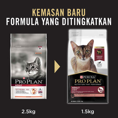 Pro Plan Adult kini hadir dengan kemasan baru dan formula yang ditingkatkan bagi kucing dewasa berusia mulai 1 tahun. Pro Plan Adult dibuat dari ikan salmon asli sebagai bahan baku utama dan diperkaya Probiotik untuk mendukung kesehatan pencernaan serta daya tahan tubuh kucing kesayanganmu.