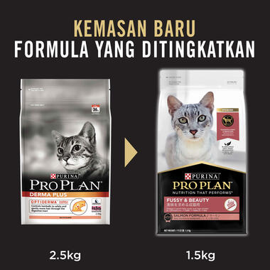 Pro Plan Fussy Beauty hadir dengan kemasan baru dan formula yang ditingkatkan untuk membantu menjaga kilau dan kelembutan rambut kucing dewasa. Tak hanya dibuat dari ikan salmon asli sebagai bahan baku utama dengan bentuk kibble yang bervariasi, Pro Plan Fussy &; Beauty juga diperkaya dengan Probiotik aktif untuk membantu menjaga kesehatan pencernaan dan kekebalan tubuh kucing kesayanganmu.