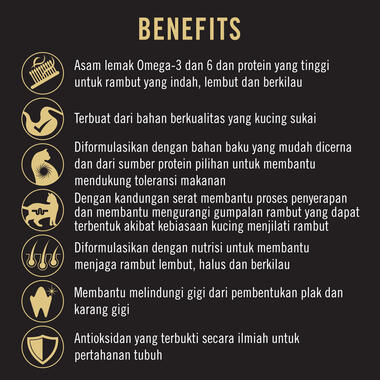- Kombinasi serat untuk mengontrol pembentukan hairball dengan cara dikeluarkan bersama kotoran dengan aman dan lembut