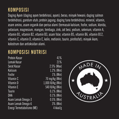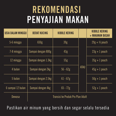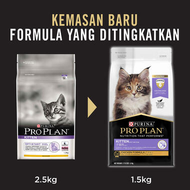 Pro Plan Kitten kini hadir dengan kemasan baru dan formula yang ditingkatkan, dan dibuat dari daging ayam asli sebagai bahan baku utamanya. Diperkaya Kolostrum dan nutrisi lainnya, Pro Plan Kitten diperuntukkan bagi anak kucing hingga berusia satu tahun untuk membantu mengoptimalkan sistem imun serta tumbuh kembangnya.